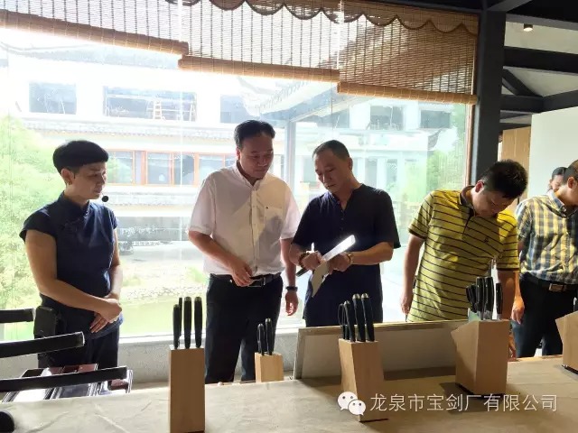 龍泉寶劍廠張葉勝大師向市委吳松平副書(shū)記介紹公司新開(kāi)發(fā)的廚刀系列產(chǎn)品,并展示產(chǎn)品工藝及其鋒利度。