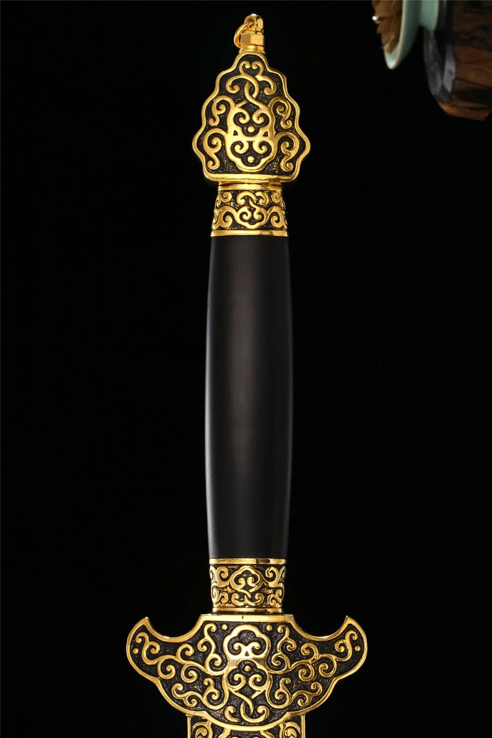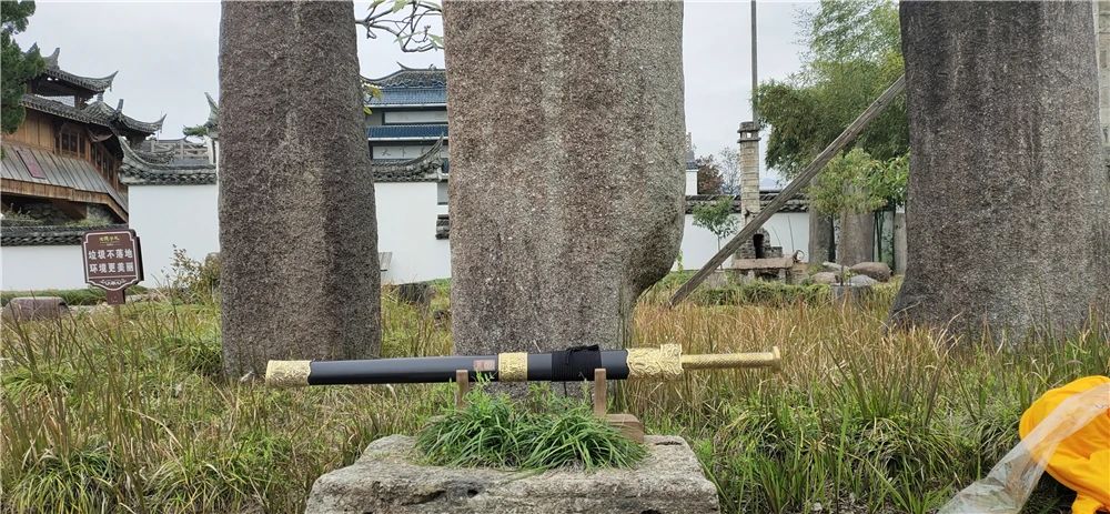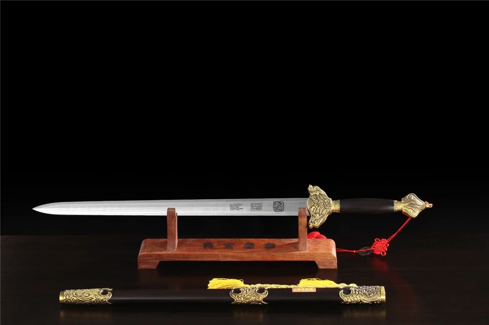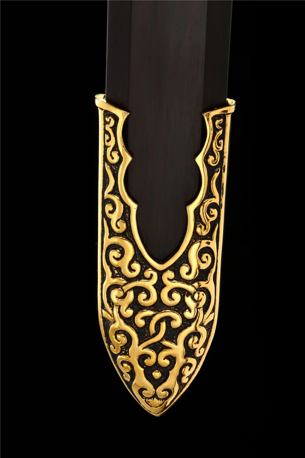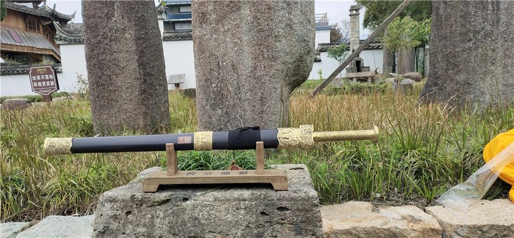 此款寶劍,以上等毛鐵鍛造,手工精研,八面劍型,黃銅雕裝,劍裝表面鍍金,銘文“龍泉寶劍”,此劍為張葉勝大師所制,工藝精湛,外觀精美,收藏極為霸氣!