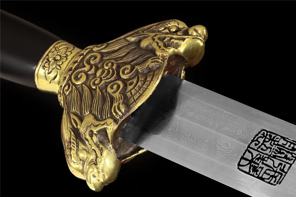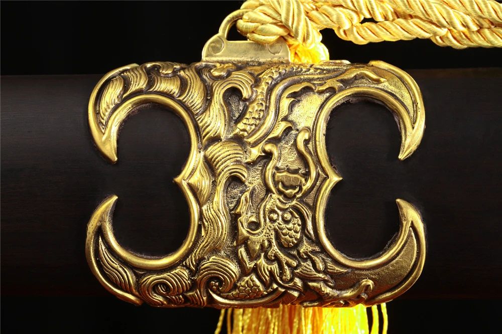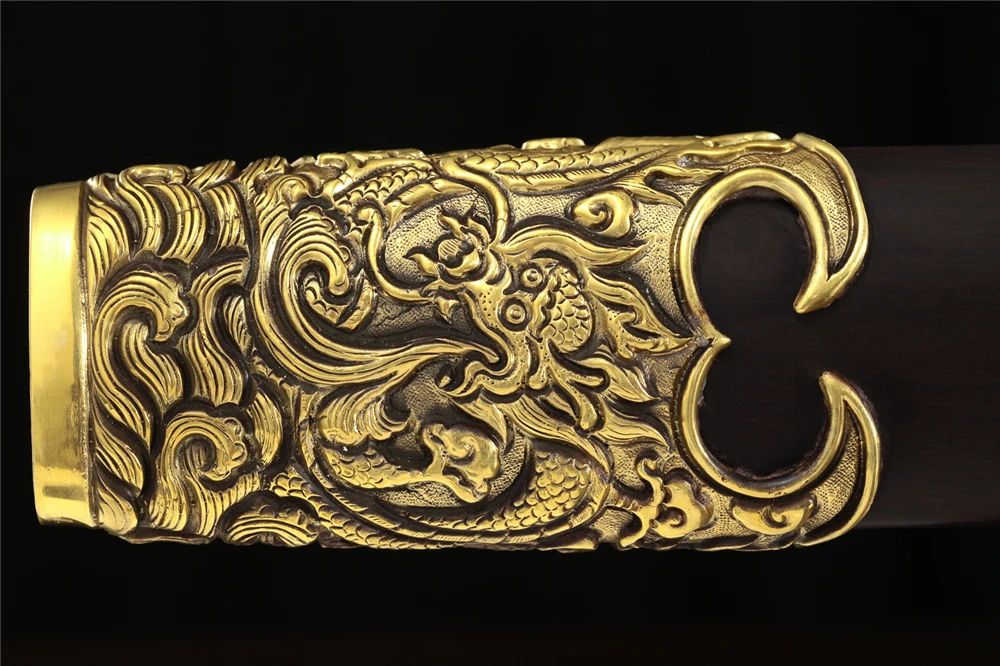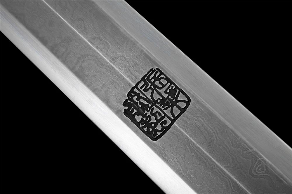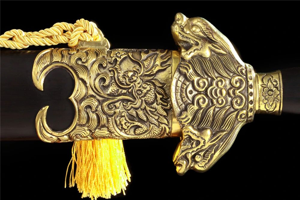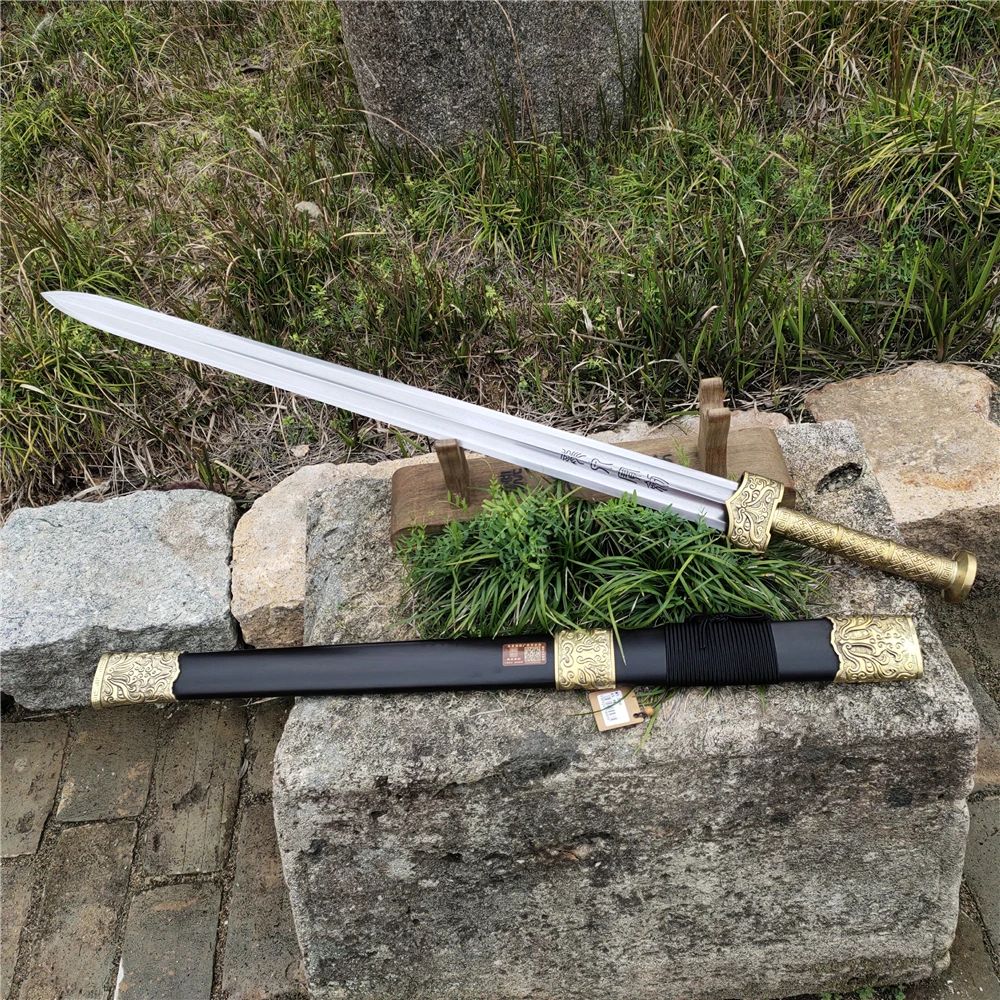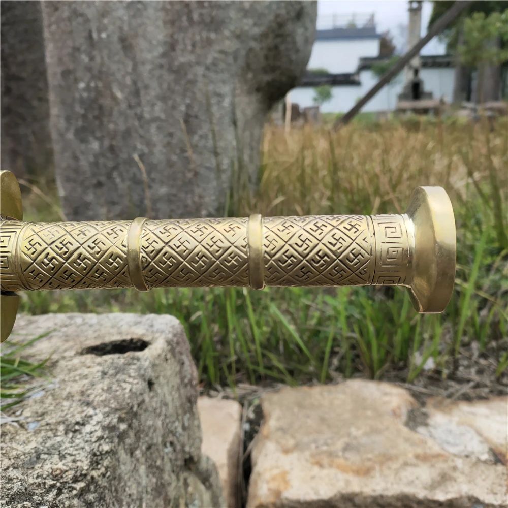 此款龍淵劍,為張葉勝大師所鍛造,以毛鐵打造八面重劍,威力極大,可輕易斬斷鋼筋,黃銅雕龍劍裝,整劍寬厚,十分大氣!