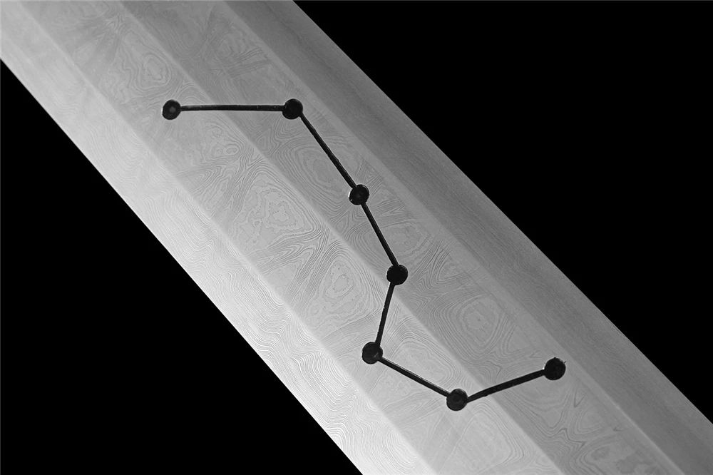 相傳歐冶子和干將為鑄此劍,鑿開茨山,放出山中溪水,引至鑄劍爐旁成北斗七星環(huán)列的七個池中,是名「七星」。劍成之后,俯視劍身,如同登高山而下望深淵,縹緲而深邃仿佛有巨龍盤臥,是名「龍淵」。
