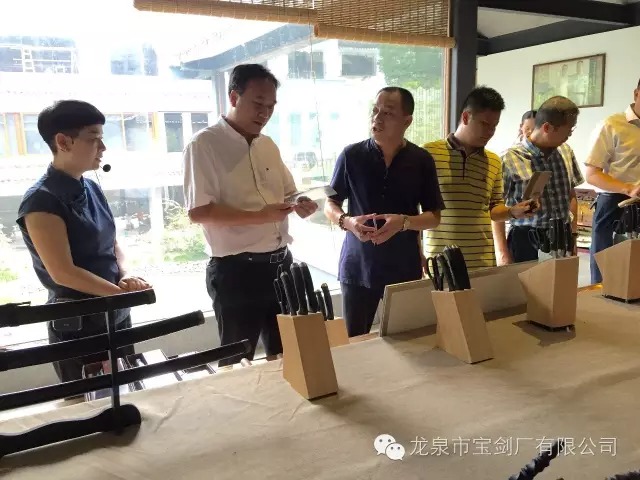 龍泉寶劍廠張葉勝大師向市委吳松平副書(shū)記介紹公司新開(kāi)發(fā)的廚刀系列產(chǎn)品,并展示產(chǎn)品工藝及其鋒利度。