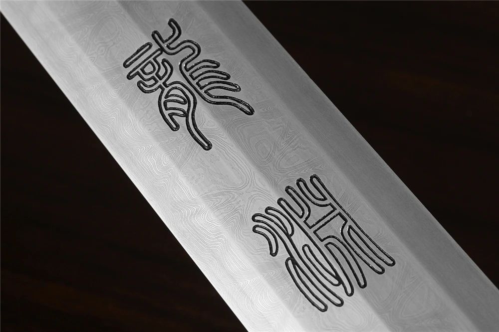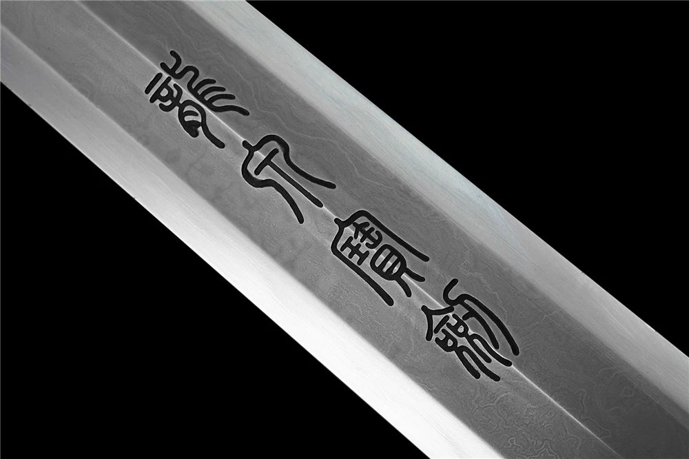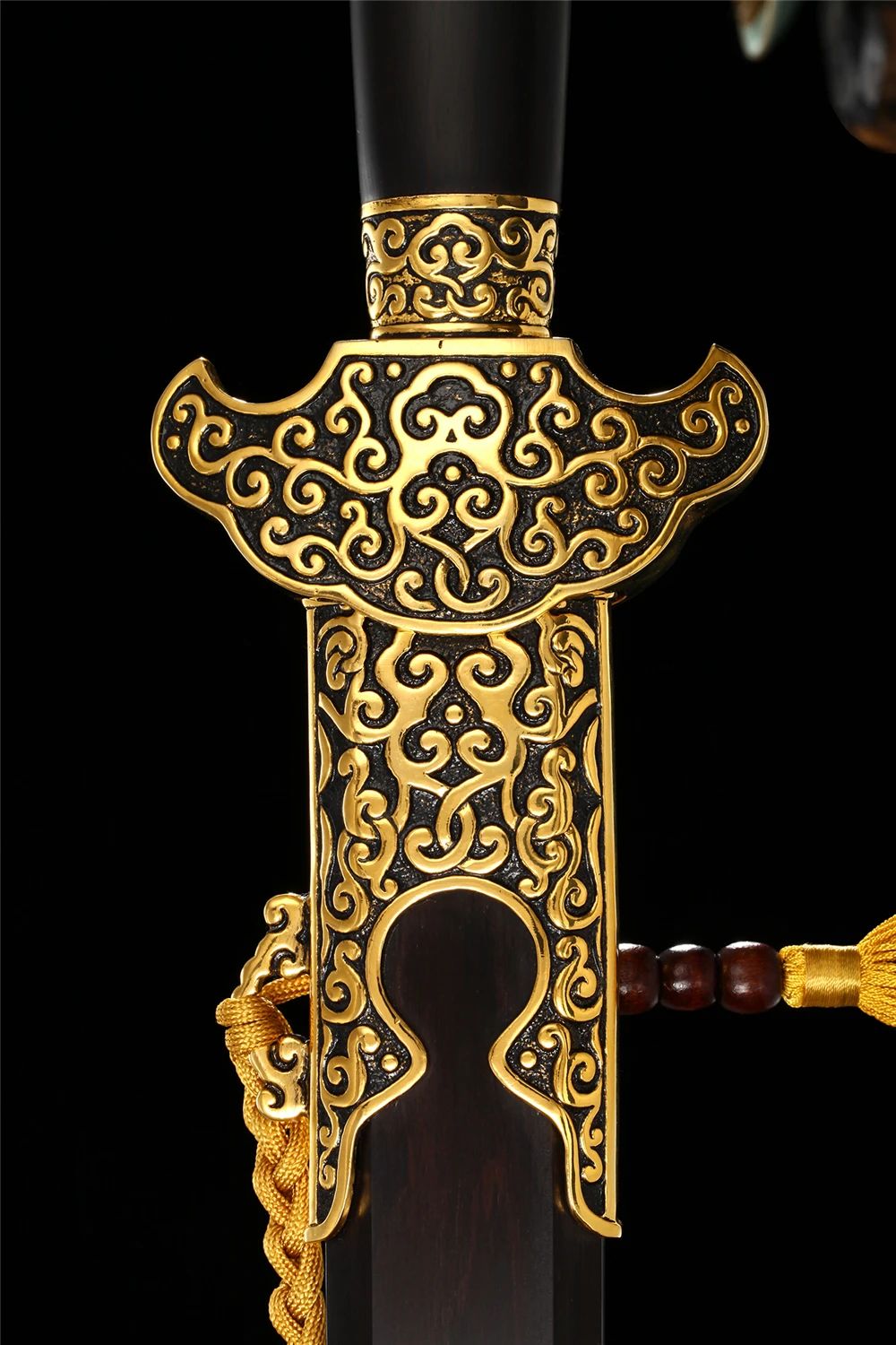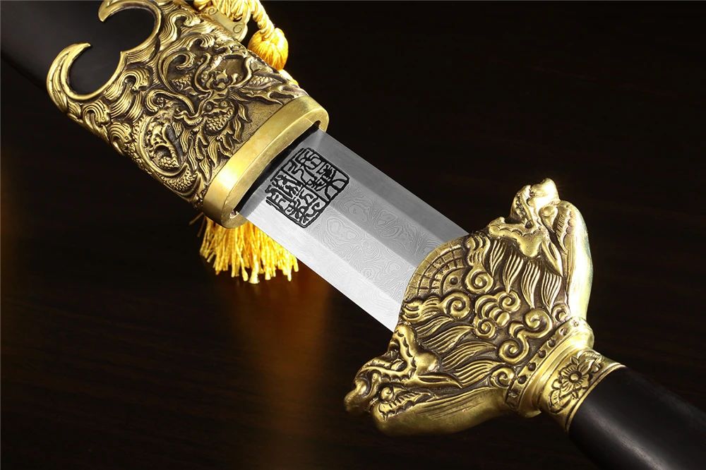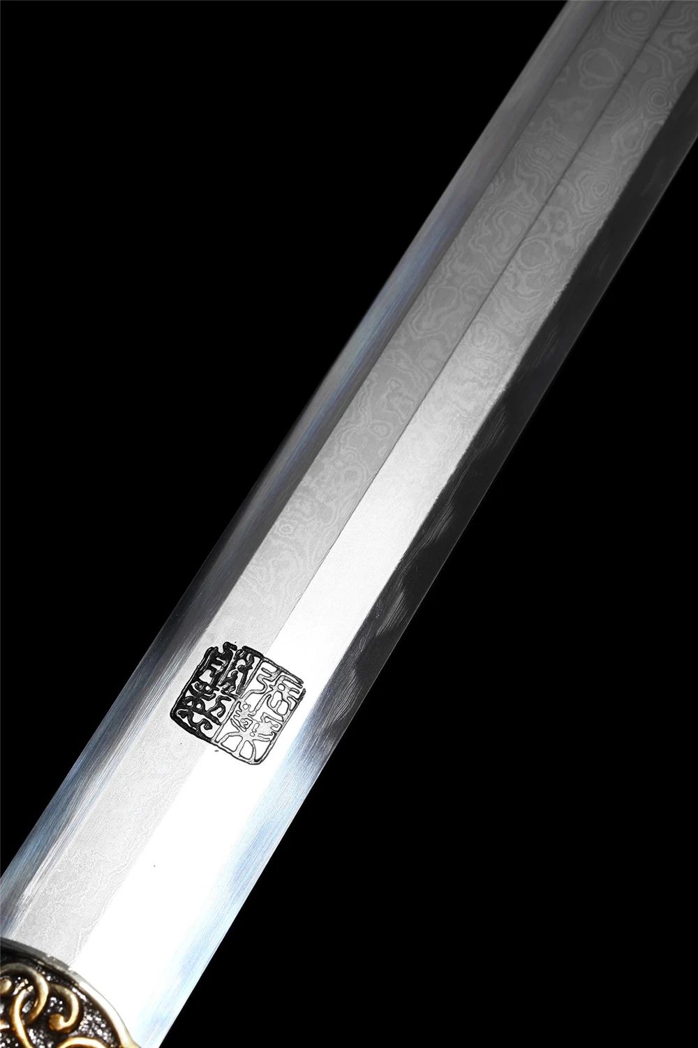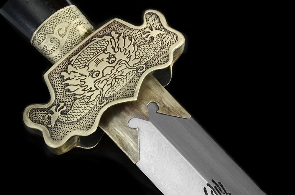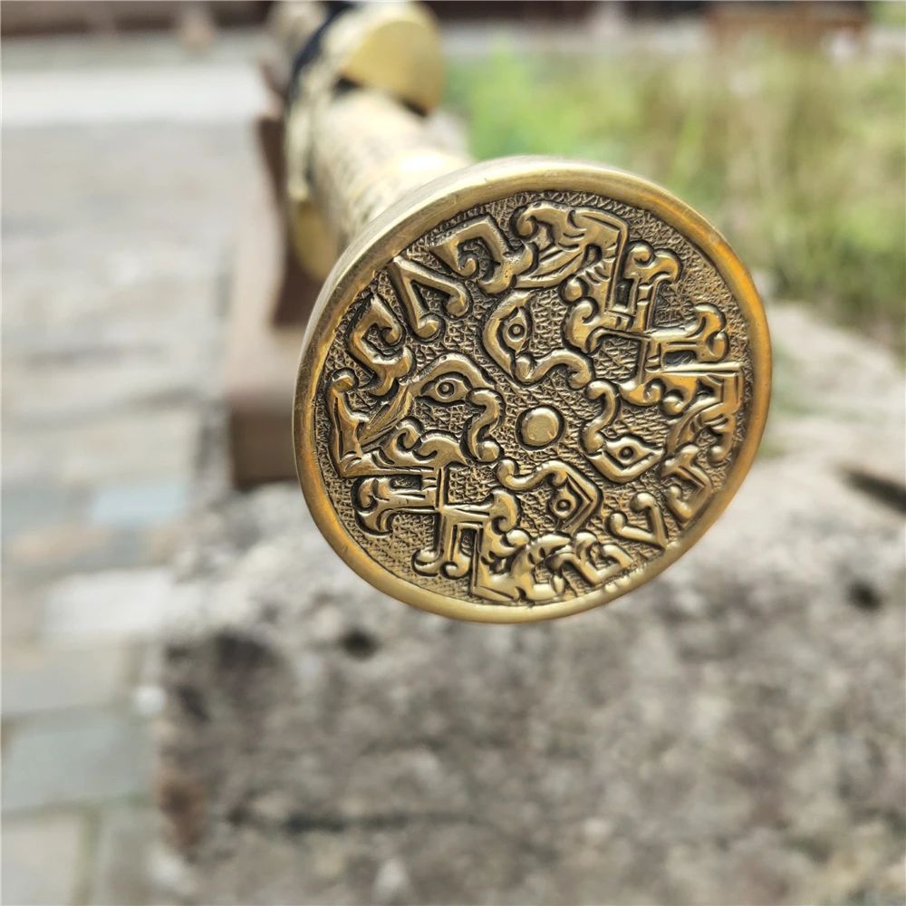 此款龍淵劍,為張葉勝大師所鍛造,以毛鐵打造八面重劍,威力極大,可輕易斬斷鋼筋,黃銅雕龍劍裝,整劍寬厚,十分大氣!