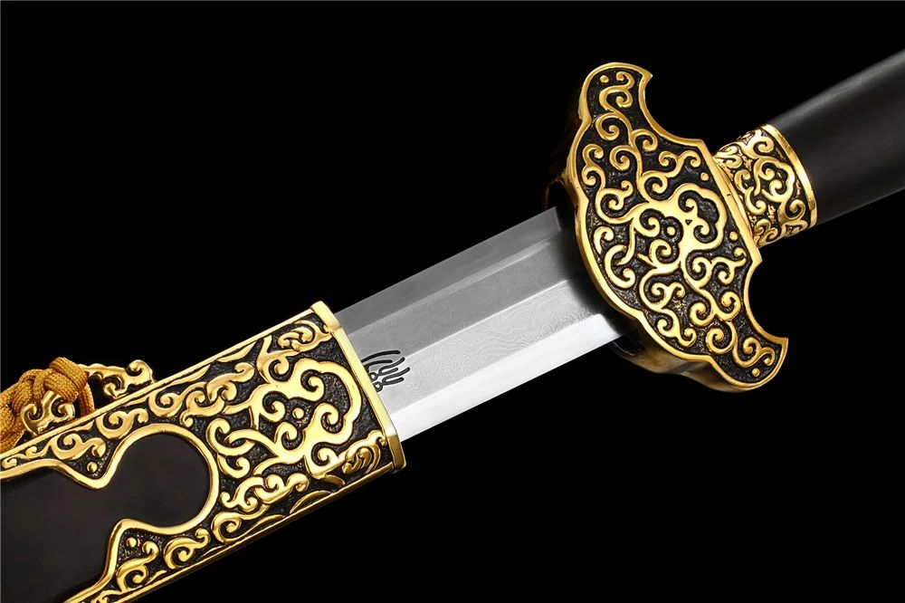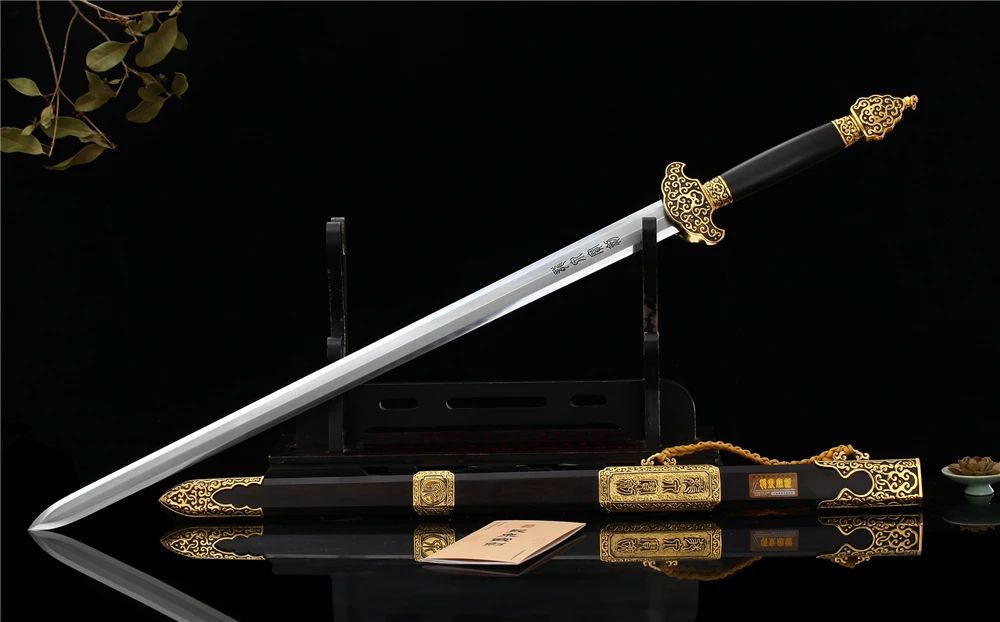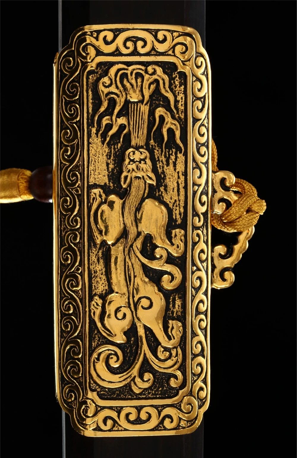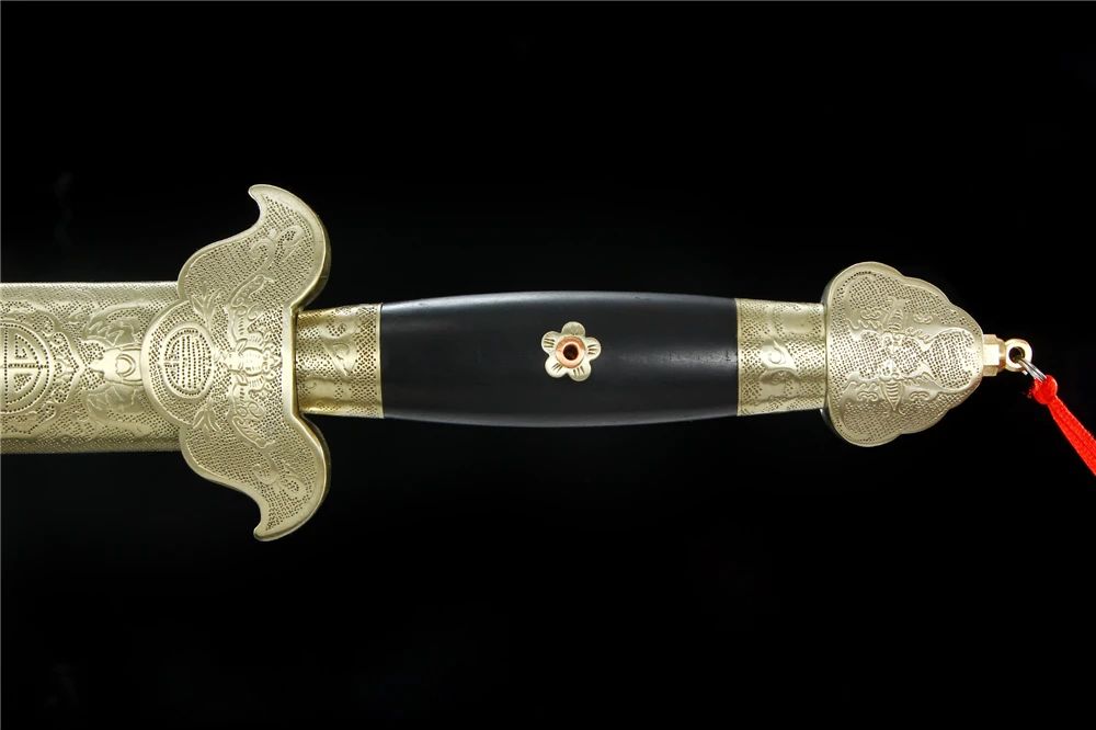 此款寶劍,以上等毛鐵鍛造,手工精研,八面劍型,黃銅雕裝,劍裝表面鍍金,銘文“龍泉寶劍”,此劍為張葉勝大師所制,工藝精湛,外觀精美,收藏極為霸氣!